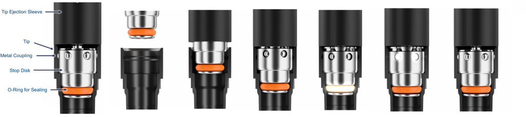 チップまたはツールをチャンネルに装着すると、Oリングが圧縮され、機械的な力を加えることなく気密シールを形成します。